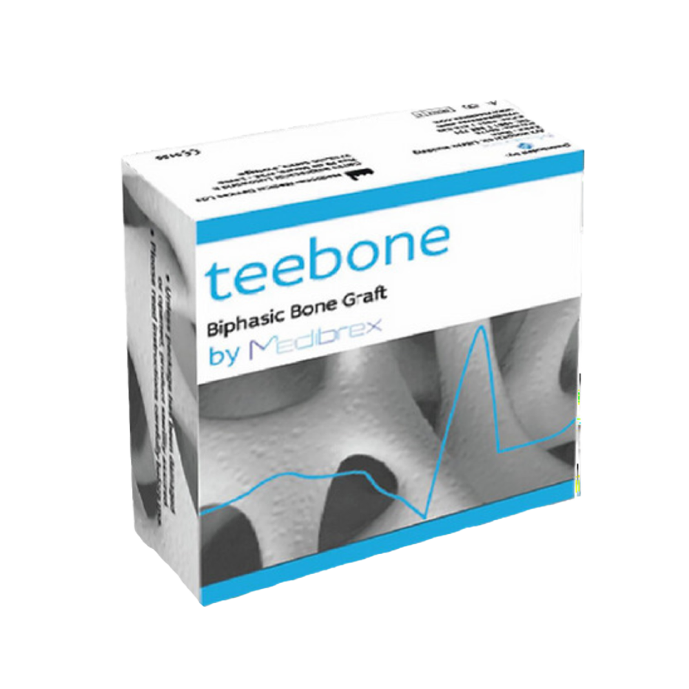 Teebone is an osteoconductive alloplastic material designed for bone substitution. Its biphasic nature allows a controlled resorption profile similar to human bone. Due to its composition, 75% Hydroxiapatite and 25% Beta tricalcium phosphate, Teebone regenerates new bone through two different stages of activation. The breakdown of B-TCP by the osteoclast will free ions that enhance bone grow, while the hydroxyapatite acts as support for the bone ingrown whiting the graft, being slowly substituted.